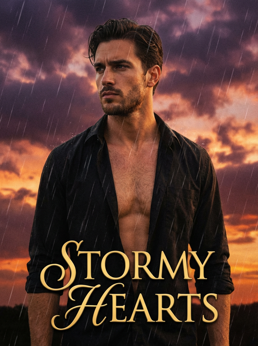 model as romance novel cover, open shirt, brooding look, dramatic sky backdrop, passionate aesthetic