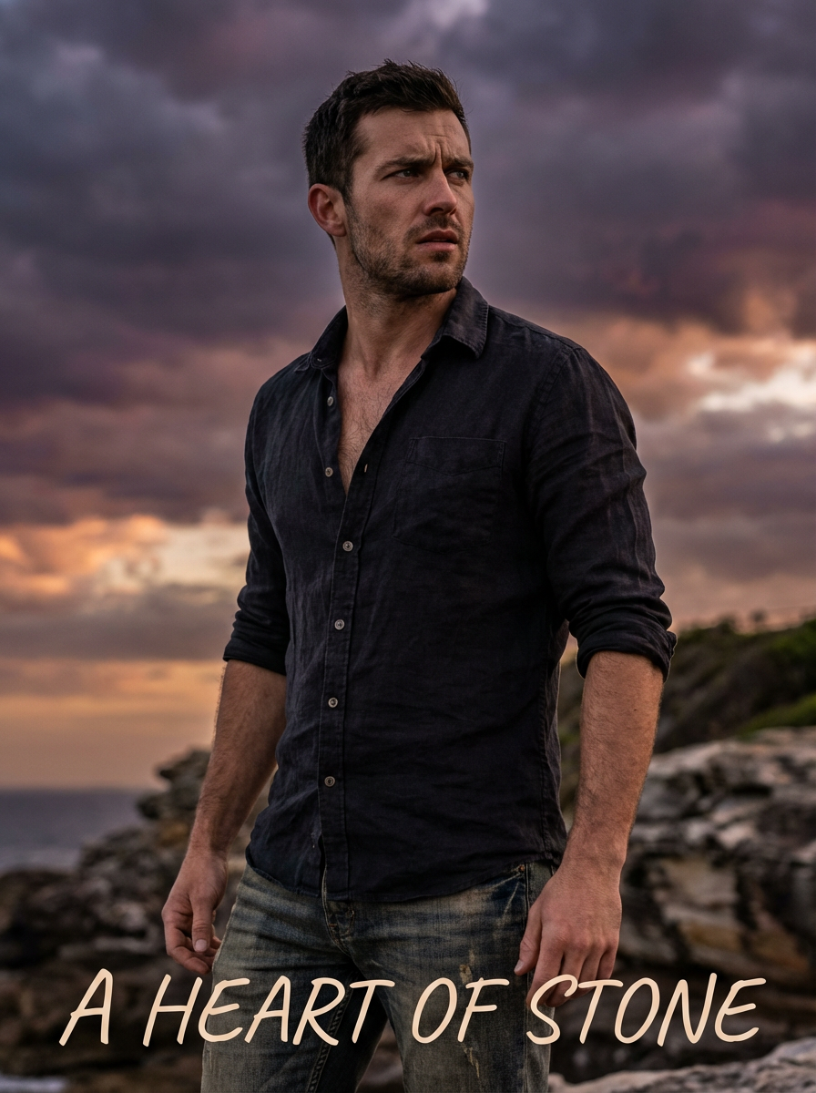 model as romance novel cover, open shirt, brooding look, dramatic sky backdrop, passionate aesthetic