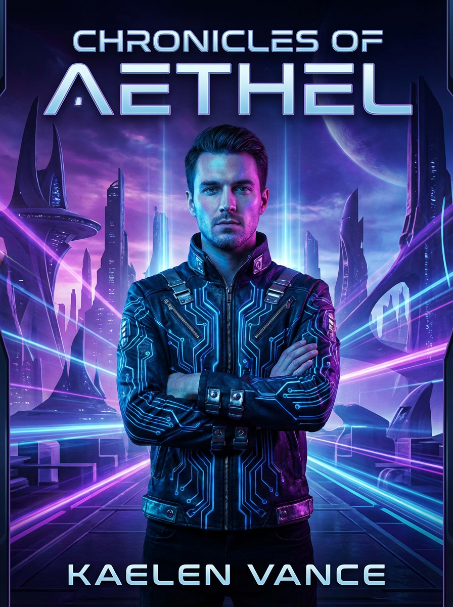 model as sci-fi book cover, futuristic styling, technological elements, otherworldly lighting