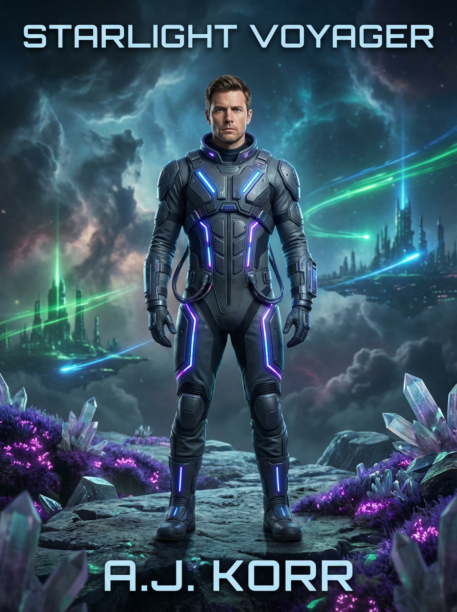 model as sci-fi book cover, futuristic styling, technological elements, otherworldly lighting