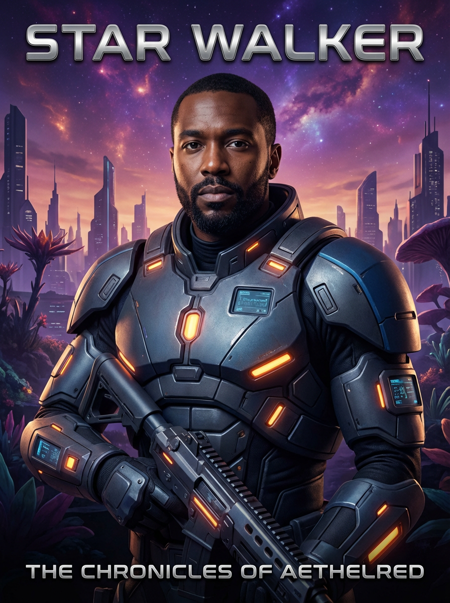 model as sci-fi book cover, futuristic styling, technological elements, otherworldly lighting