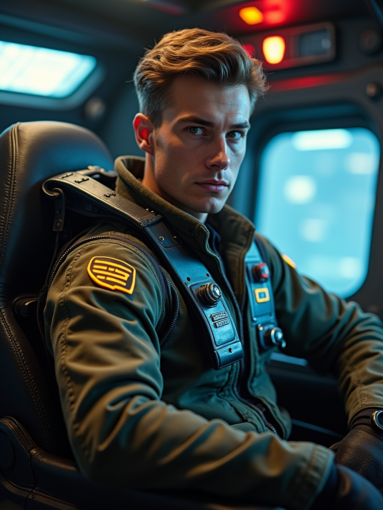 model as sci-fi pilot in a spaceship cockpit set, wearing a rugged pilot uniform with tech gadgets, dramatic lighting, space-themed props