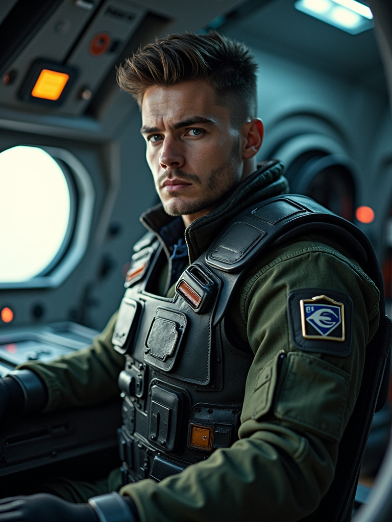 model as sci-fi pilot in a spaceship cockpit set, wearing a rugged pilot uniform with tech gadgets, dramatic lighting, space-themed props