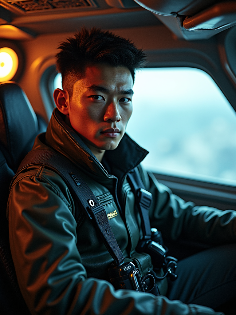 model as sci-fi pilot in a spaceship cockpit set, wearing a rugged pilot uniform with tech gadgets, dramatic lighting, space-themed props
