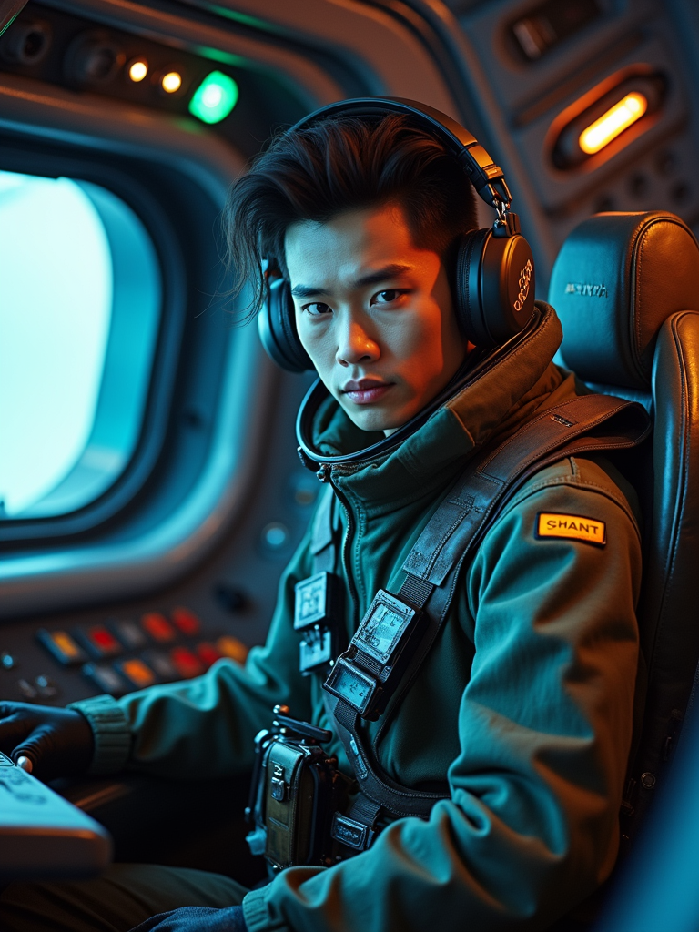 model as sci-fi pilot in a spaceship cockpit set, wearing a rugged pilot uniform with tech gadgets, dramatic lighting, space-themed props