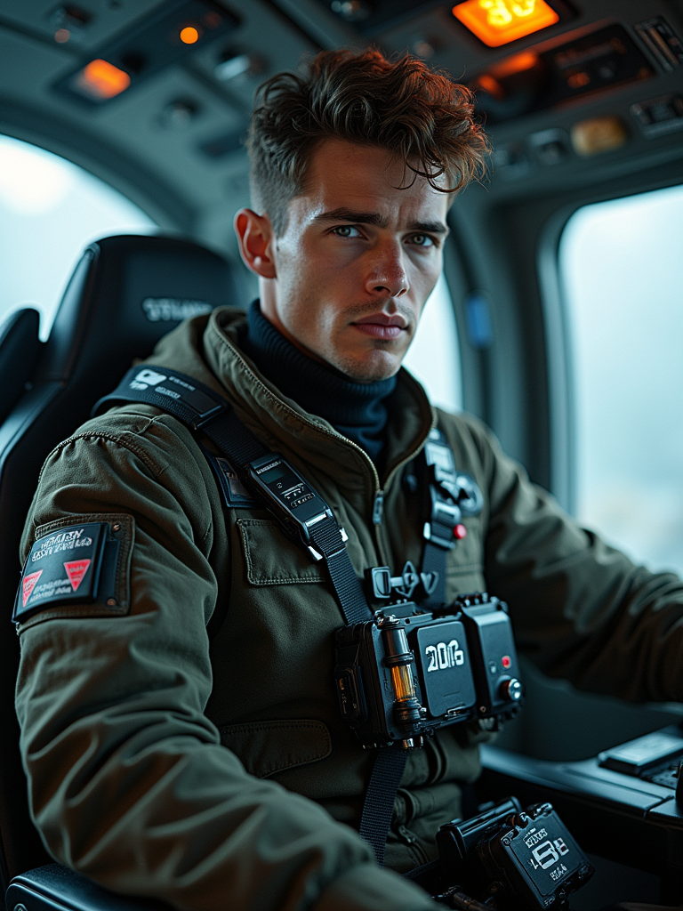 model as sci-fi pilot in a spaceship cockpit set, wearing a rugged pilot uniform with tech gadgets, dramatic lighting, space-themed props