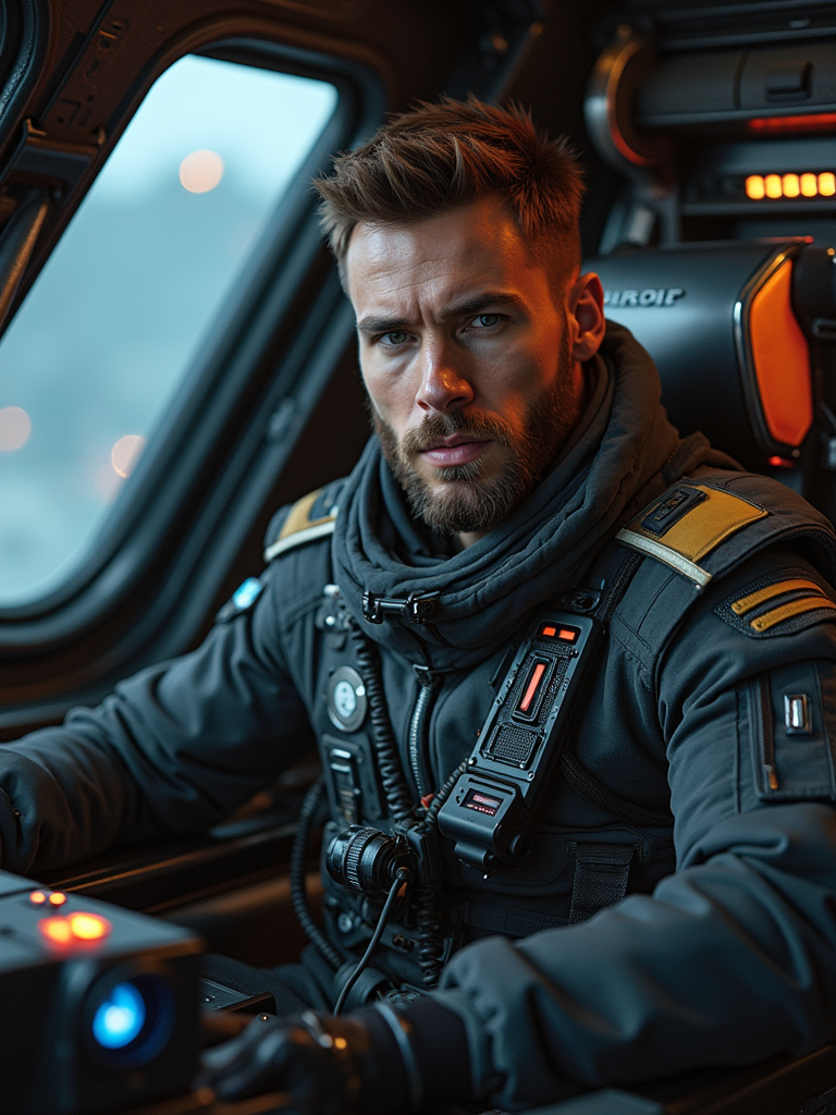 model as sci-fi pilot in a spaceship cockpit set, wearing a rugged pilot uniform with tech gadgets, dramatic lighting, space-themed props