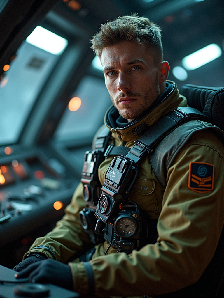 model as sci-fi pilot in a spaceship cockpit set, wearing a rugged pilot uniform with tech gadgets, dramatic lighting, space-themed props