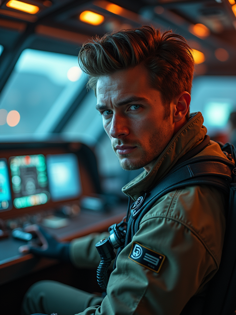 model as sci-fi pilot in a spaceship cockpit set, wearing a rugged pilot uniform with tech gadgets, dramatic lighting, space-themed props