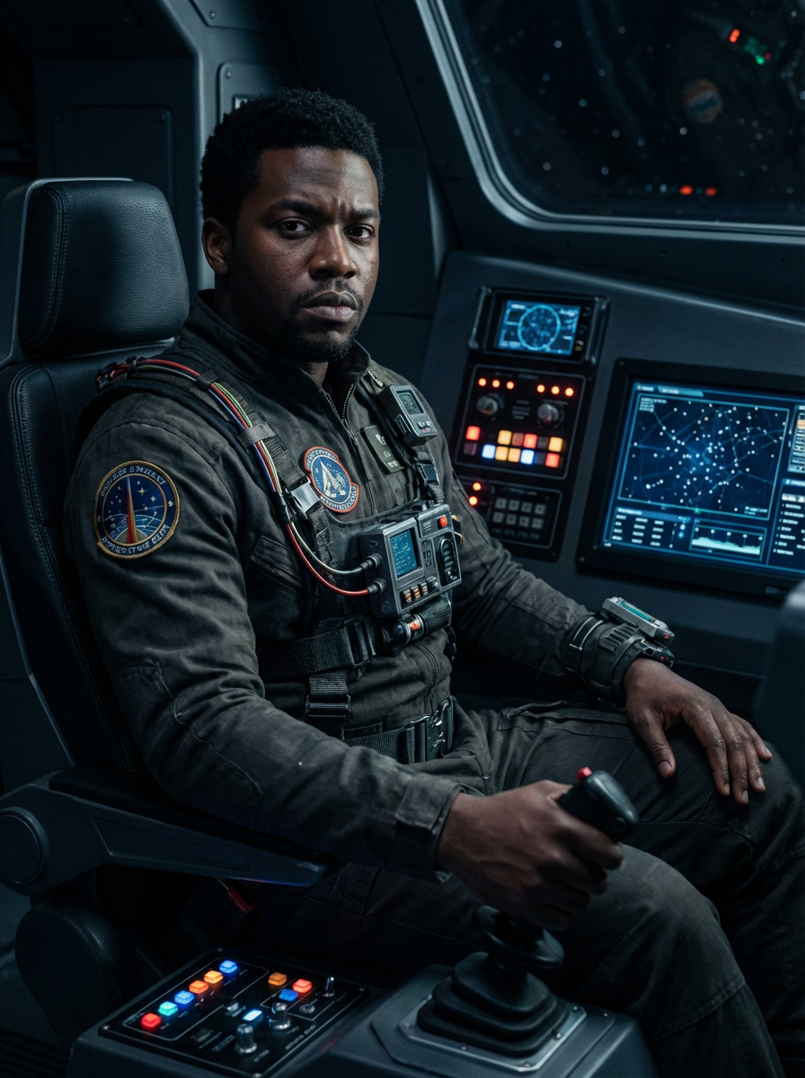 model as sci-fi pilot in a spaceship cockpit set, wearing a rugged pilot uniform with tech gadgets, dramatic lighting, space-themed props