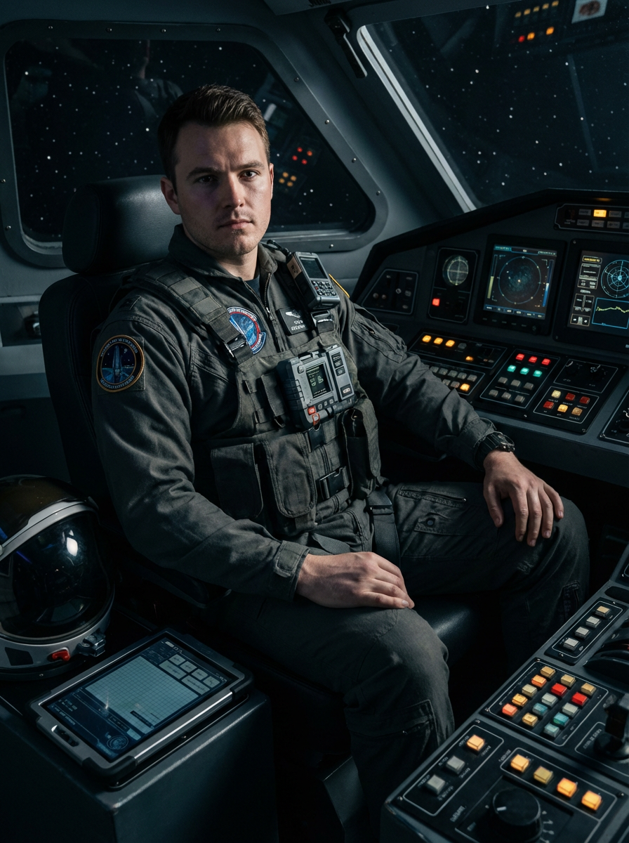 model as sci-fi pilot in a spaceship cockpit set, wearing a rugged pilot uniform with tech gadgets, dramatic lighting, space-themed props