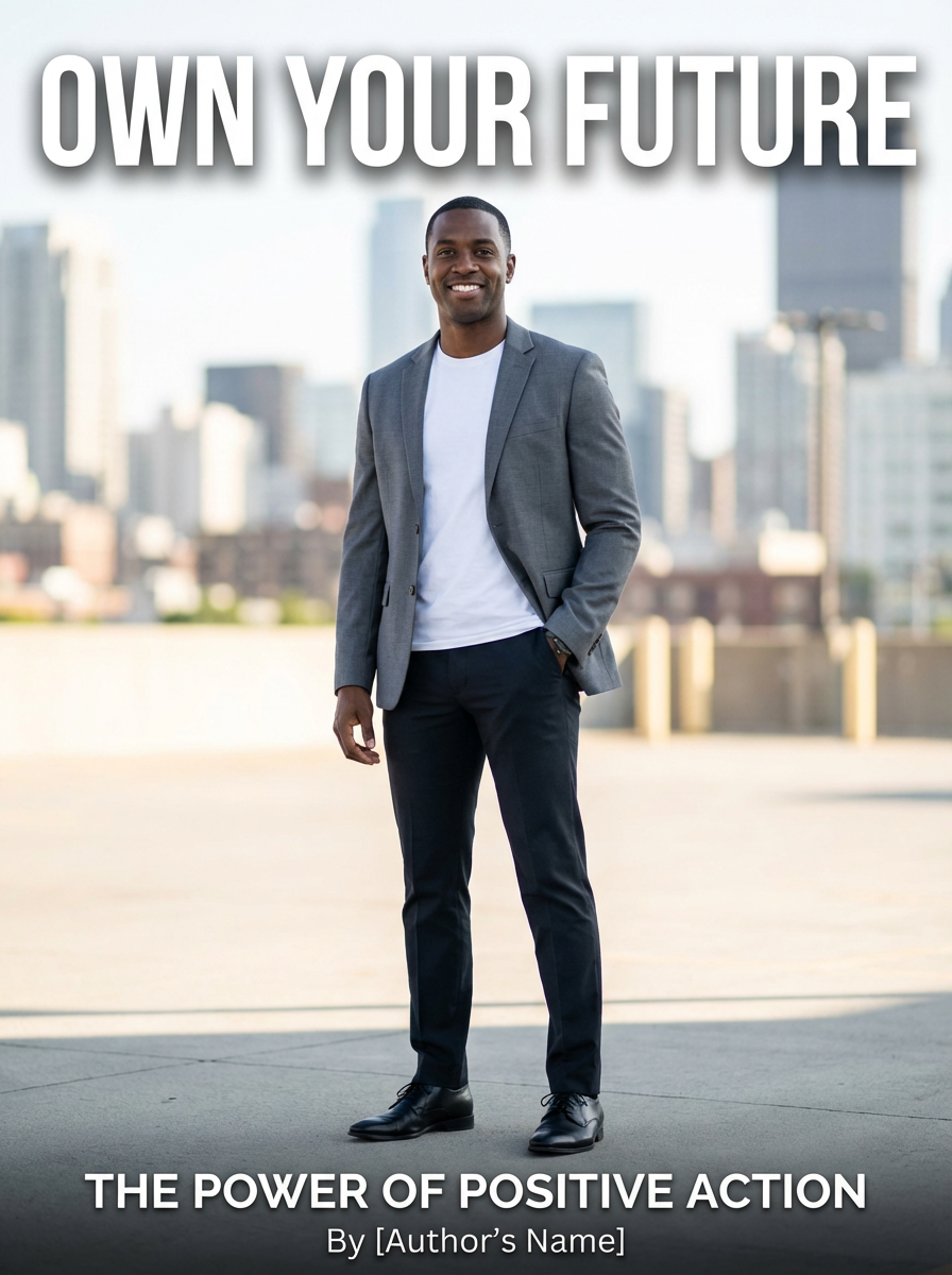 model as self-help book cover, confident inspiring pose, bright optimistic lighting, motivational energy