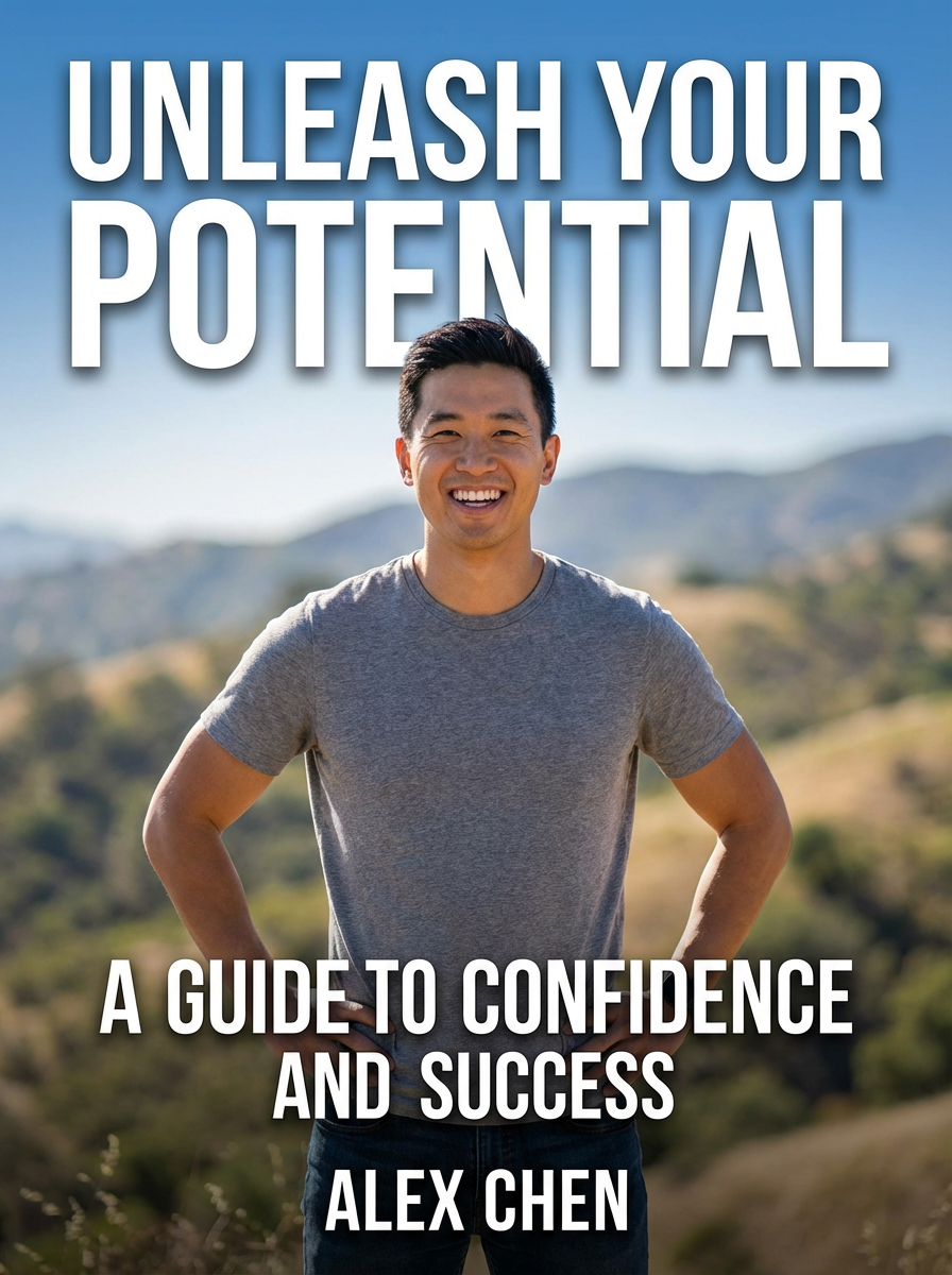 model as self-help book cover, confident inspiring pose, bright optimistic lighting, motivational energy