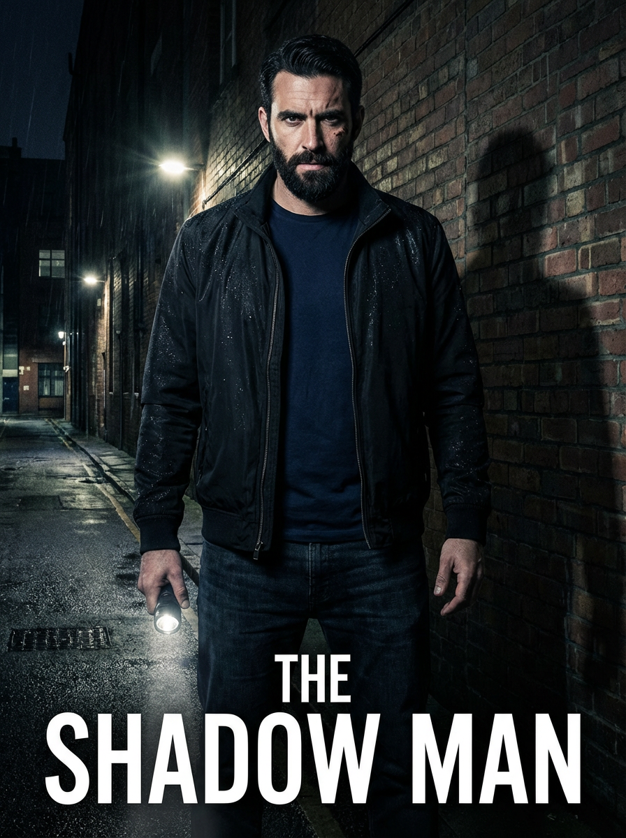 model as thriller book cover, intense gaze, mysterious shadows, urban night setting, suspenseful mood