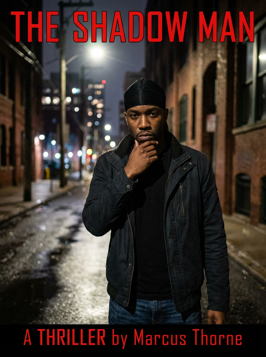 model as thriller book cover, intense gaze, mysterious shadows, urban night setting, suspenseful mood