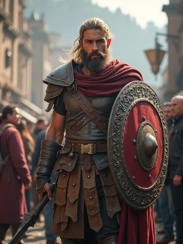 model as video game character, outdoors at a convention building, wearing a fantasy warrior outfit with a large shield and sword, interacting with a crowd