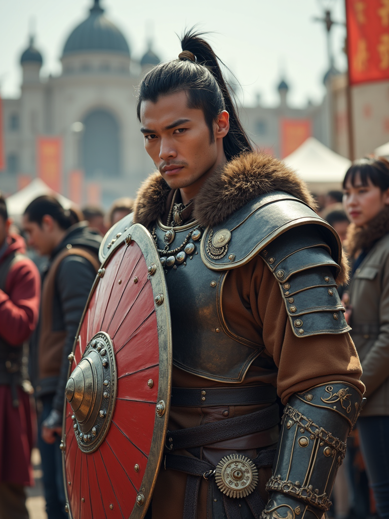 model as video game character, outdoors at a convention building, wearing a fantasy warrior outfit with a large shield and sword, interacting with a crowd