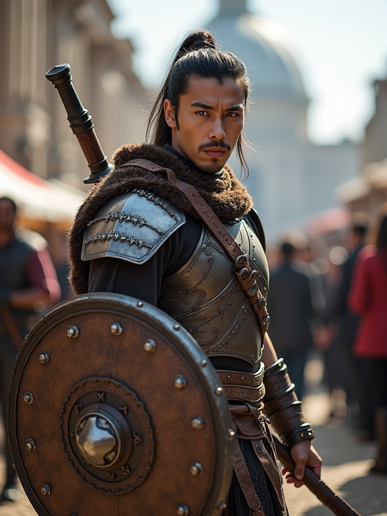 model as video game character, outdoors at a convention building, wearing a fantasy warrior outfit with a large shield and sword, interacting with a crowd