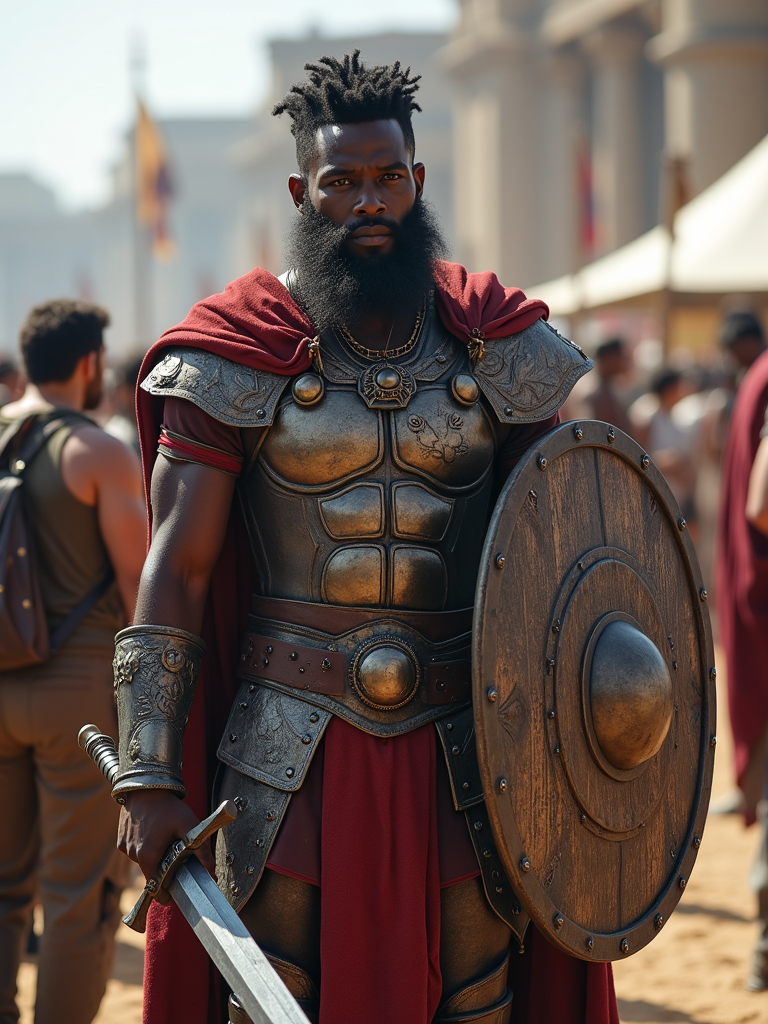model as video game character, outdoors at a convention building, wearing a fantasy warrior outfit with a large shield and sword, interacting with a crowd