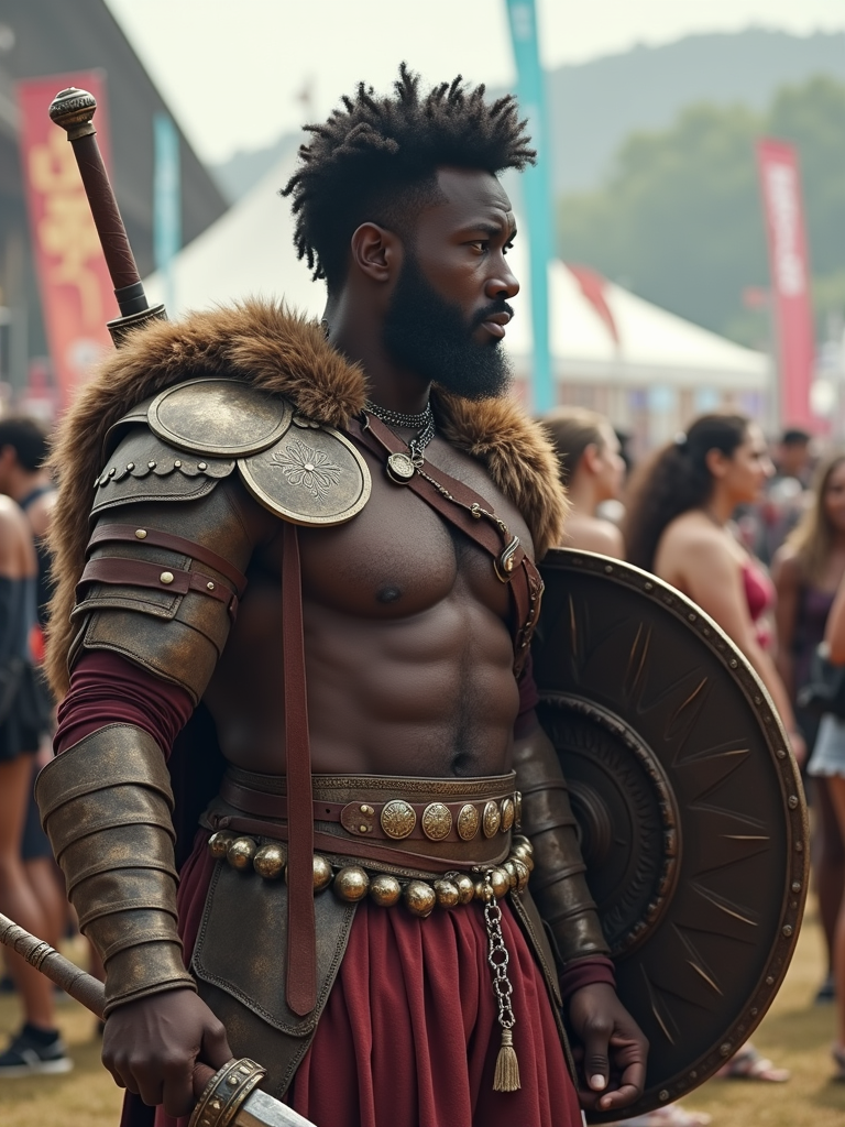 model as video game character, outdoors at a convention building, wearing a fantasy warrior outfit with a large shield and sword, interacting with a crowd