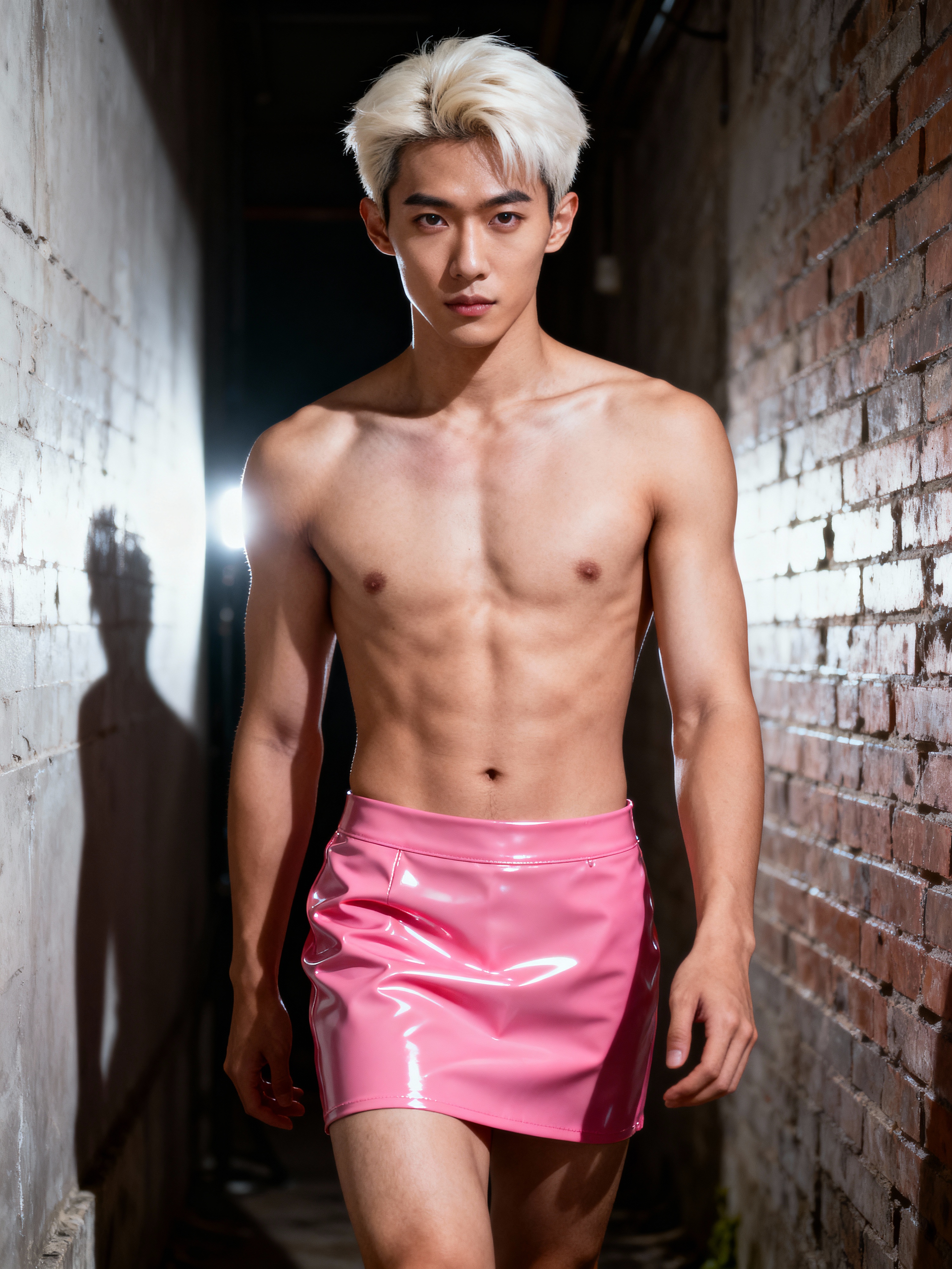 model as with platinum blonde hair and pink latex skirt