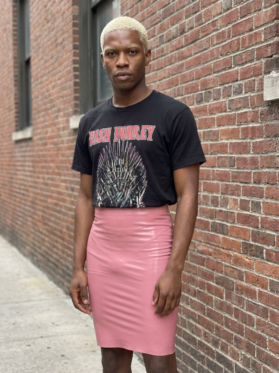 model as with platinum blonde hair and pink latex skirt