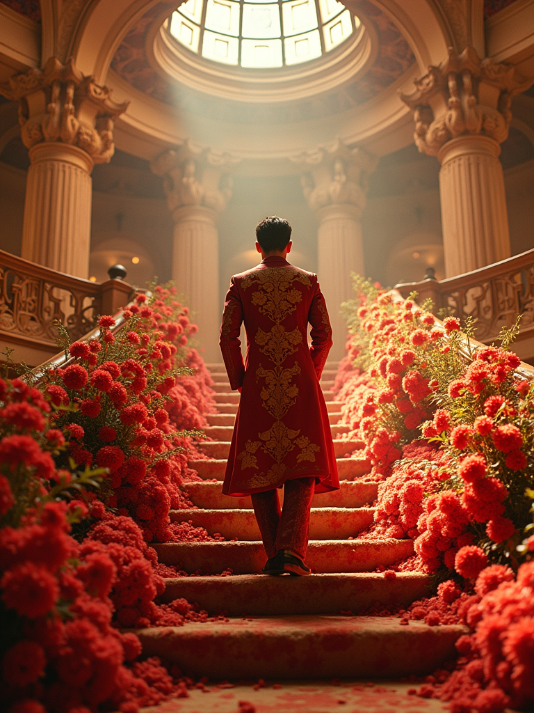 model ascending the grand staircase of the Met decorated with thousands of flowers, wearing a conceptual formal outfit with cultural elements, ornate museum architecture enhanced with gala lighting
