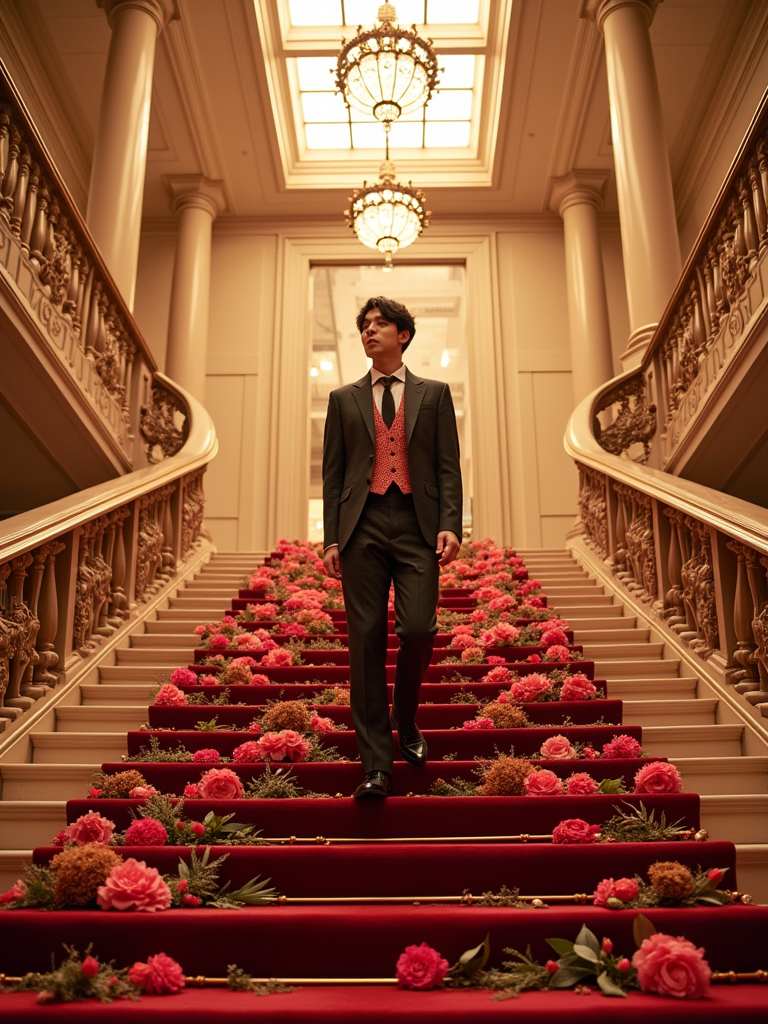 model ascending the grand staircase of the Met decorated with thousands of flowers, wearing a conceptual formal outfit with cultural elements, ornate museum architecture enhanced with gala lighting
