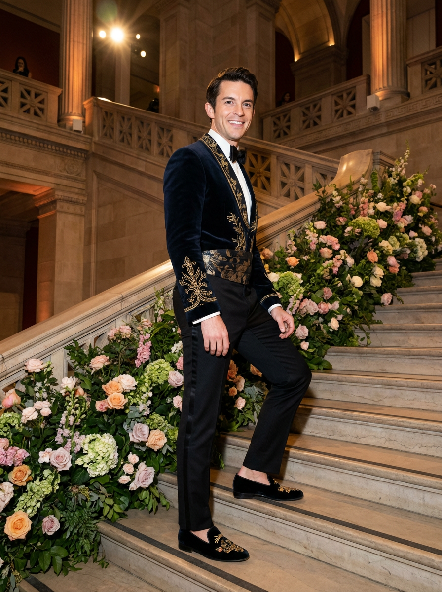 model ascending the grand staircase of the Met decorated with thousands of flowers, wearing a conceptual formal outfit with cultural elements, ornate museum architecture enhanced with gala lighting