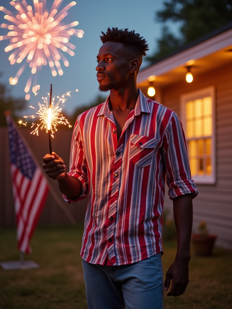 model at a 4th of July backyard barbecue, wearing a red, white and blue button-up shirt with rolled sleeves and shorts, holding sparklers and a small American flag, surrounded by patriotic decorations, fireworks bursting in the sky