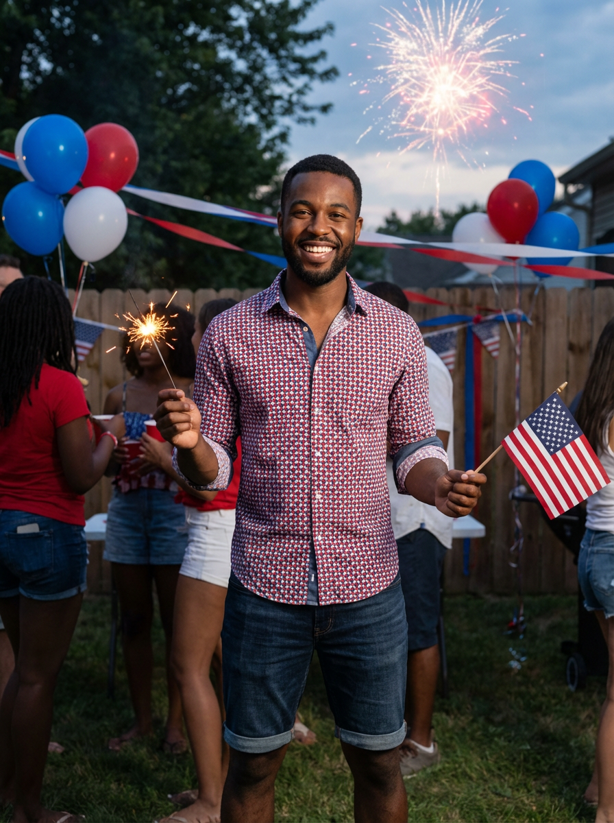 model at a 4th of July backyard barbecue, wearing a red, white and blue button-up shirt with rolled sleeves and shorts, holding sparklers and a small American flag, surrounded by patriotic decorations, fireworks bursting in the sky