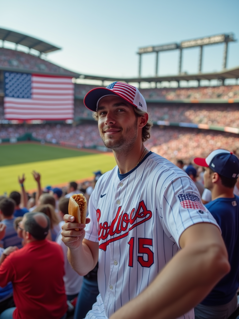 model at a baseball game in a historic stadium, wearing a team jersey, American flag baseball cap, holding a hot dog and waving a small flag, surrounded by excited fans in patriotic colors, giant American flag being unfurled across the field