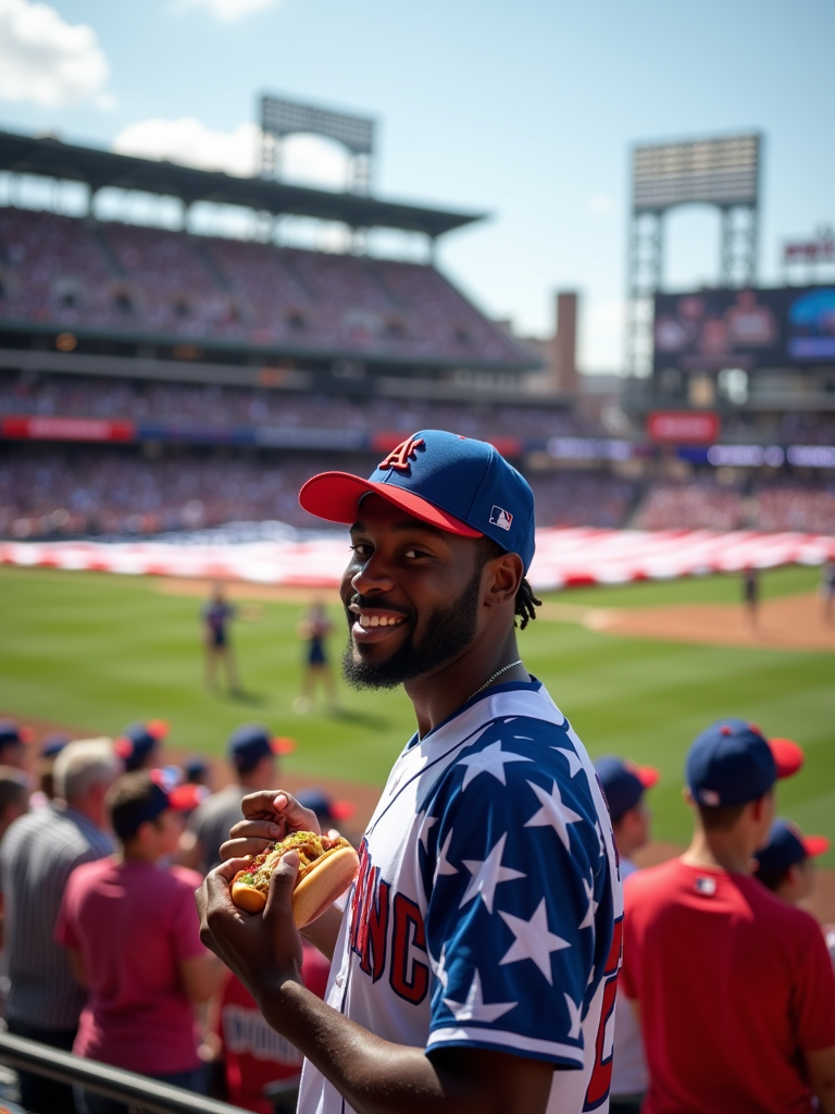 model at a baseball game in a historic stadium, wearing a team jersey, American flag baseball cap, holding a hot dog and waving a small flag, surrounded by excited fans in patriotic colors, giant American flag being unfurled across the field
