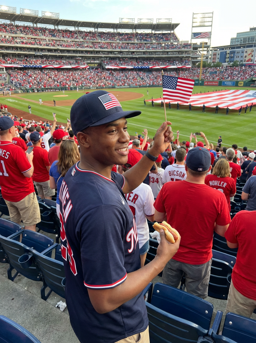 model at a baseball game in a historic stadium, wearing a team jersey, American flag baseball cap, holding a hot dog and waving a small flag, surrounded by excited fans in patriotic colors, giant American flag being unfurled across the field