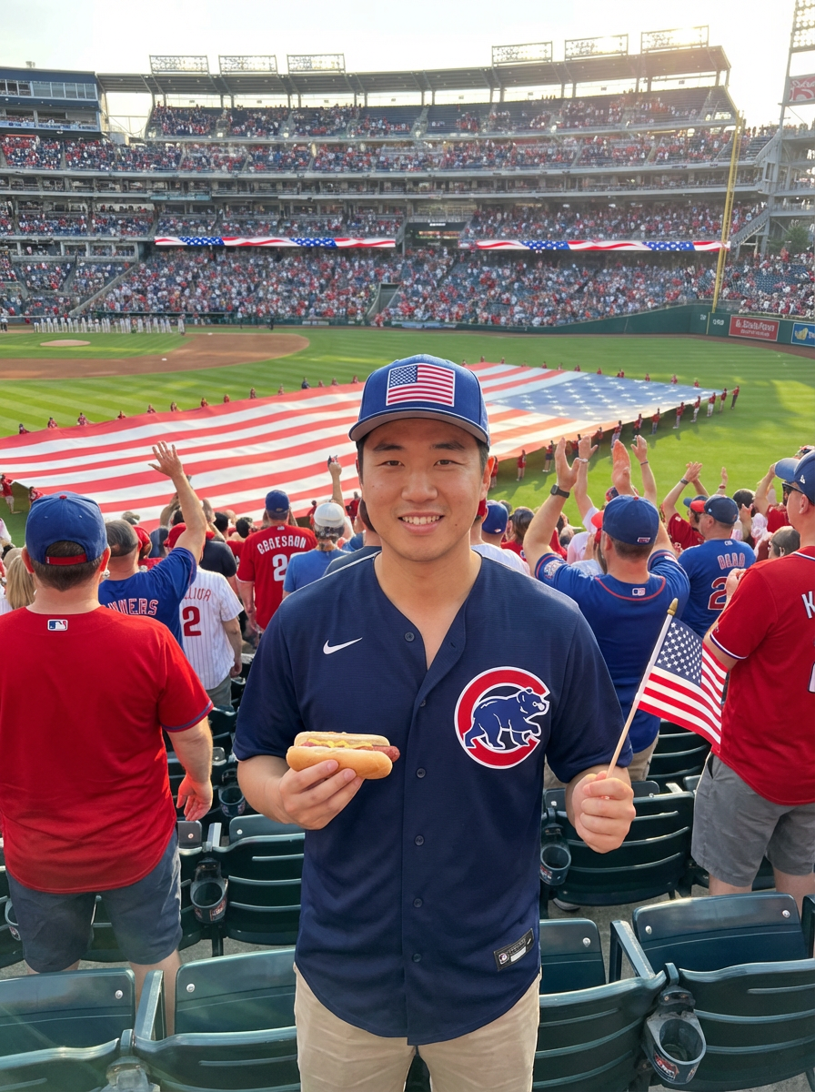 model at a baseball game in a historic stadium, wearing a team jersey, American flag baseball cap, holding a hot dog and waving a small flag, surrounded by excited fans in patriotic colors, giant American flag being unfurled across the field