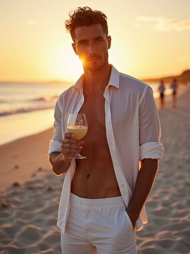 model at a beachside club in Psarou, wearing white shorts with a light linen shirt, holding a cocktail with warm evening glow
