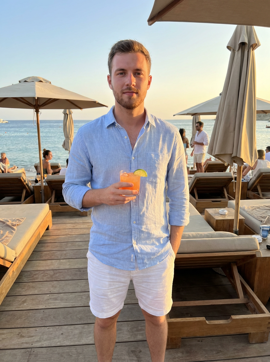 model at a beachside club in Psarou, wearing white shorts with a light linen shirt, holding a cocktail with warm evening glow