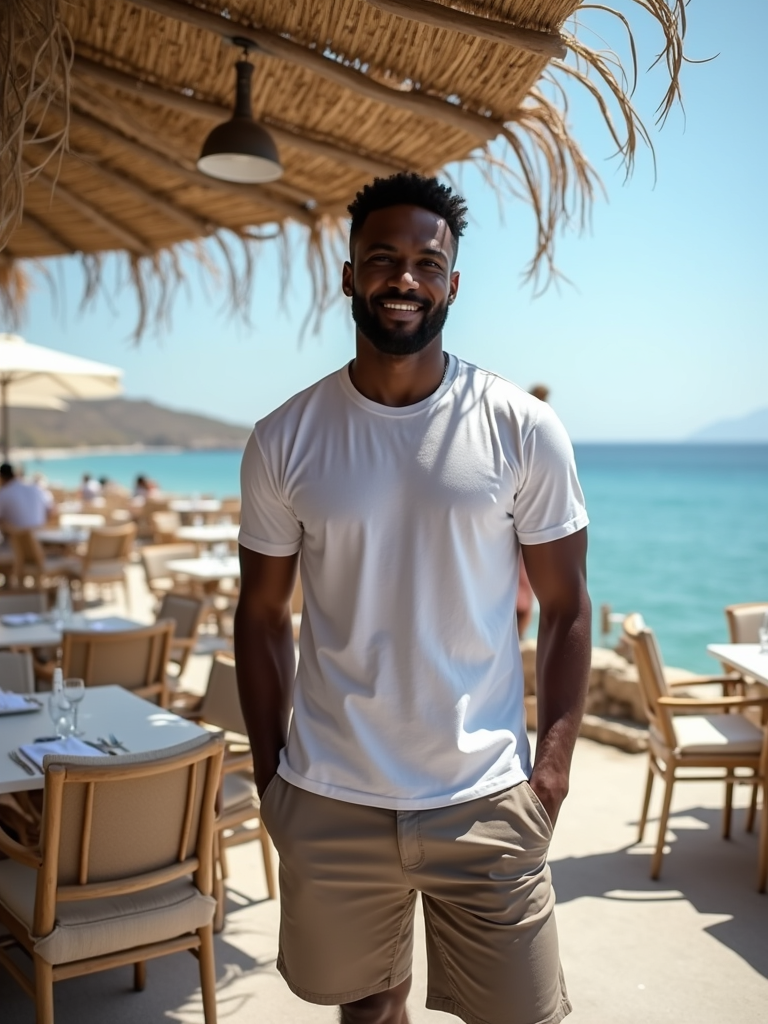 model at a beachside taverna in Kamari, wearing casual shorts with a fitted t-shirt, fresh Greek seafood and ocean views