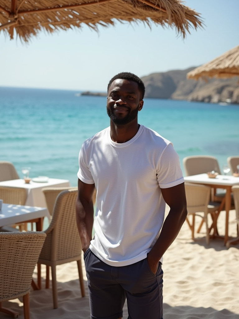 model at a beachside taverna in Kamari, wearing casual shorts with a fitted t-shirt, fresh Greek seafood and ocean views
