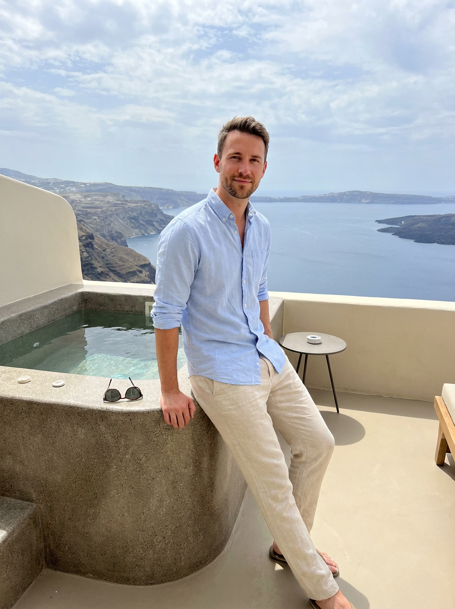 model at a boutique hotel terrace, wearing linen pants with a light cotton shirt, private jacuzzi and caldera panorama