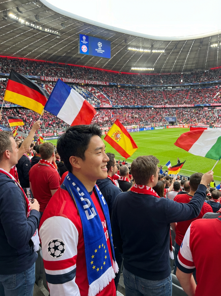 model at a Champions League football match in a historic stadium, wearing team jersey with European flag scarf, surrounded by excited fans waving flags of different European nations, stadium decorated with European unity banners