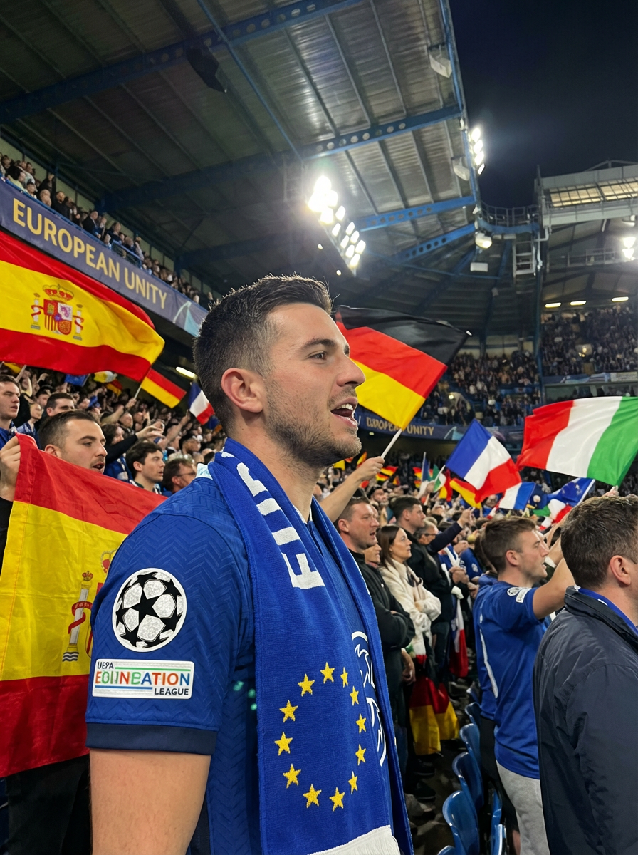model at a Champions League football match in a historic stadium, wearing team jersey with European flag scarf, surrounded by excited fans waving flags of different European nations, stadium decorated with European unity banners