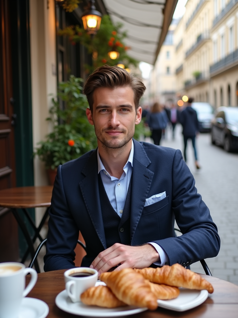 model at a classic Parisian café, seated at a charming outdoor table, wearing a sophisticated blazer with blue pocket square, enjoying espresso and croissants, cobblestone streets and flower boxes creating an authentic European ambiance