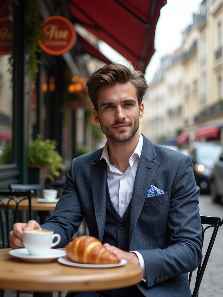 model at a classic Parisian café, seated at a charming outdoor table, wearing a sophisticated blazer with blue pocket square, enjoying espresso and croissants, cobblestone streets and flower boxes creating an authentic European ambiance
