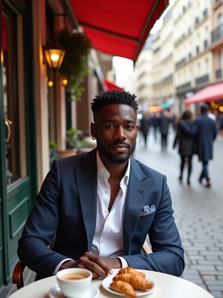model at a classic Parisian café, seated at a charming outdoor table, wearing a sophisticated blazer with blue pocket square, enjoying espresso and croissants, cobblestone streets and flower boxes creating an authentic European ambiance