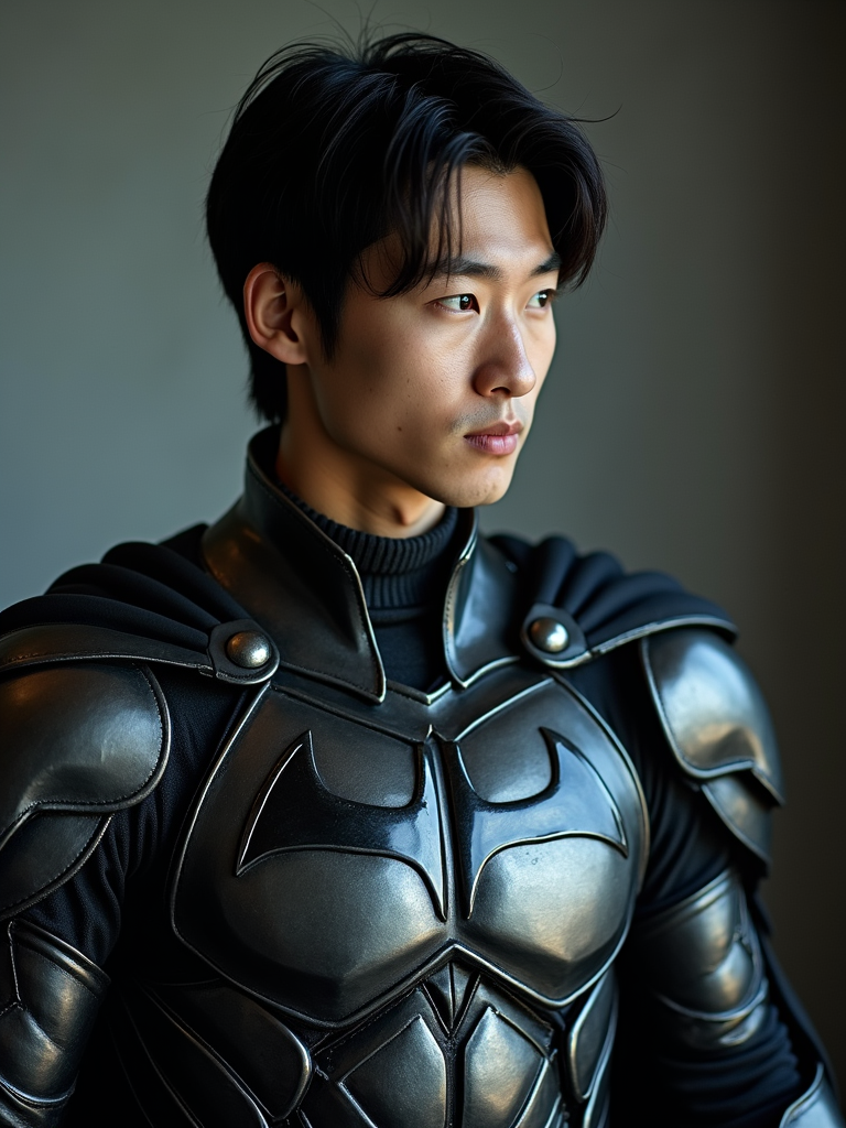 model at a cosplay photo booth, wearing a dark knight costume with metallic armor, soft focus background, emphasizing character detail