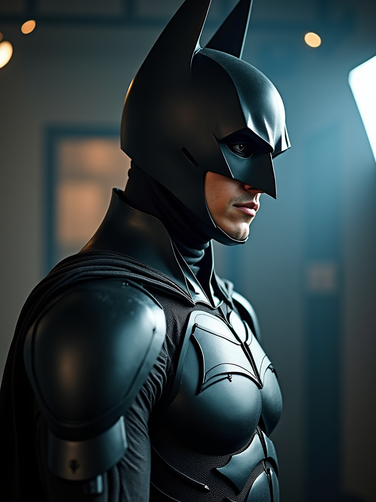 model at a cosplay photo booth, wearing a dark knight costume with metallic armor, soft focus background, emphasizing character detail