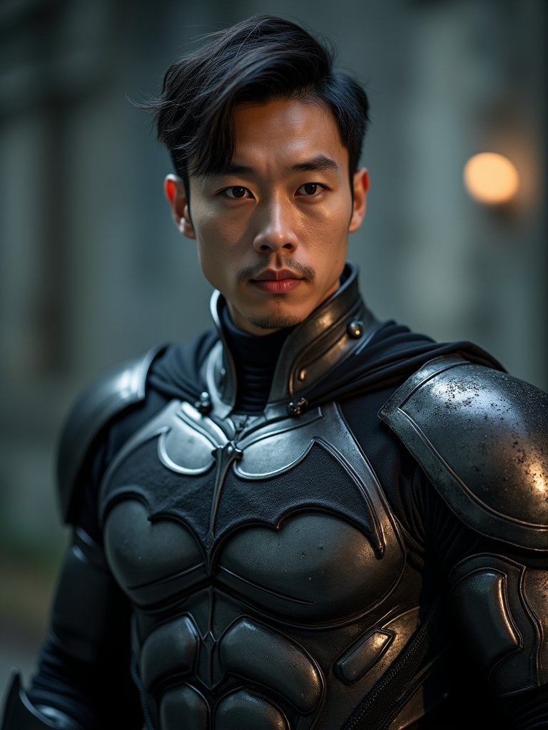 model at a cosplay photo booth, wearing a dark knight costume with metallic armor, soft focus background, emphasizing character detail