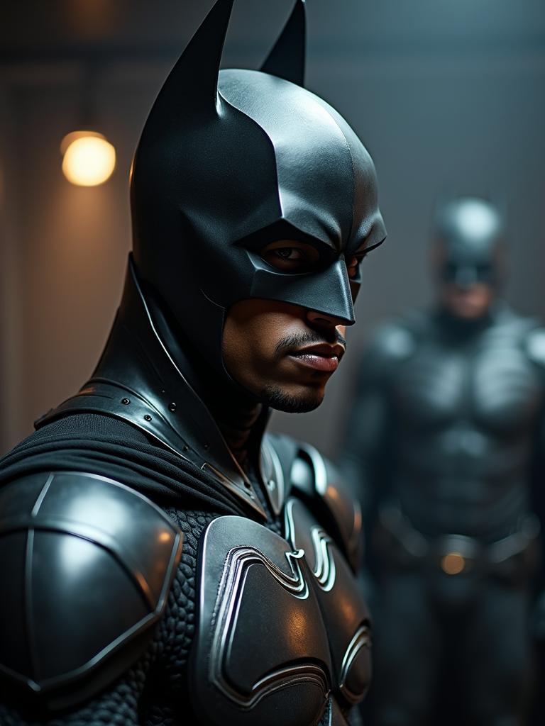 model at a cosplay photo booth, wearing a dark knight costume with metallic armor, soft focus background, emphasizing character detail