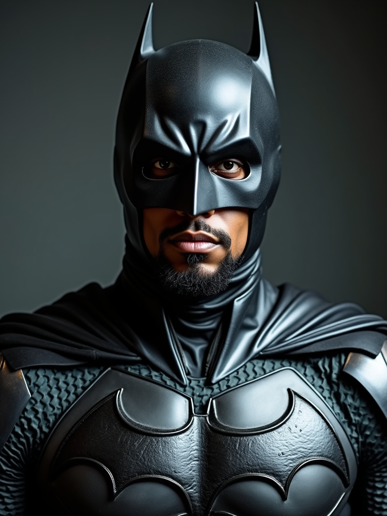 model at a cosplay photo booth, wearing a dark knight costume with metallic armor, soft focus background, emphasizing character detail